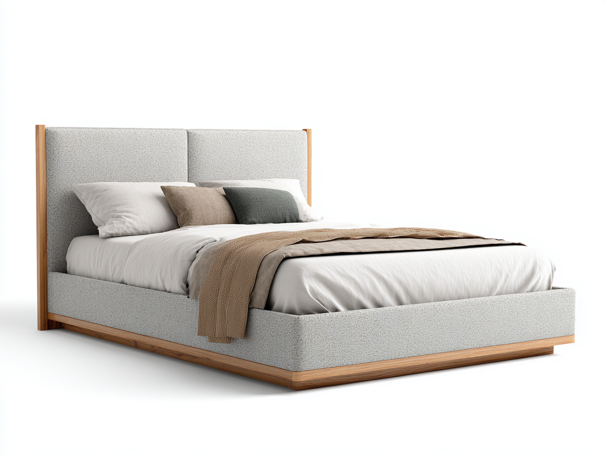 This double bed is designed for everyday bedroom use, combining a softly upholstered structure with a solid wood base. The balanced proportions and clean lines create a calm and refined look that suits modern interior spaces while offering stable sleeping support.