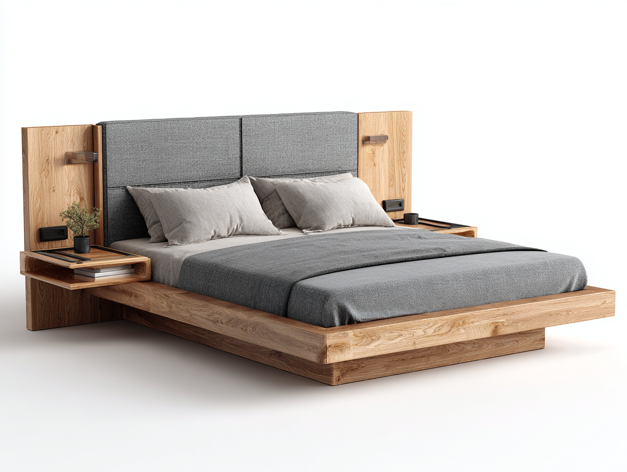 This double bed presents a balanced combination of natural wood and upholstered elements, designed for modern bedroom interiors. The low-profile structure and integrated bedside surfaces create a cohesive and practical sleeping area.