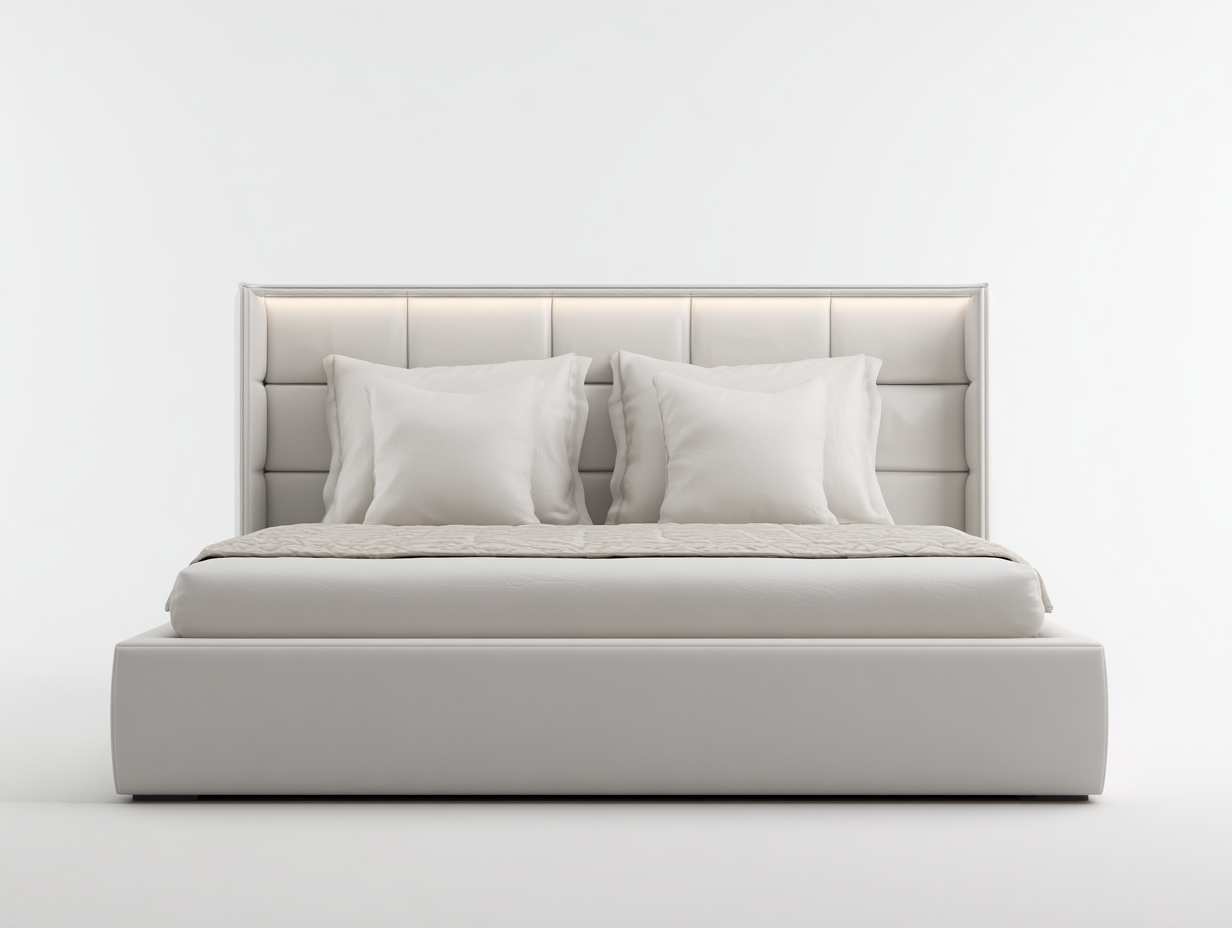 This upholstered double bed features a clean rectangular silhouette with a padded headboard, creating a calm and balanced look for modern bedrooms. The low-profile frame enhances visual openness while providing stable everyday support.