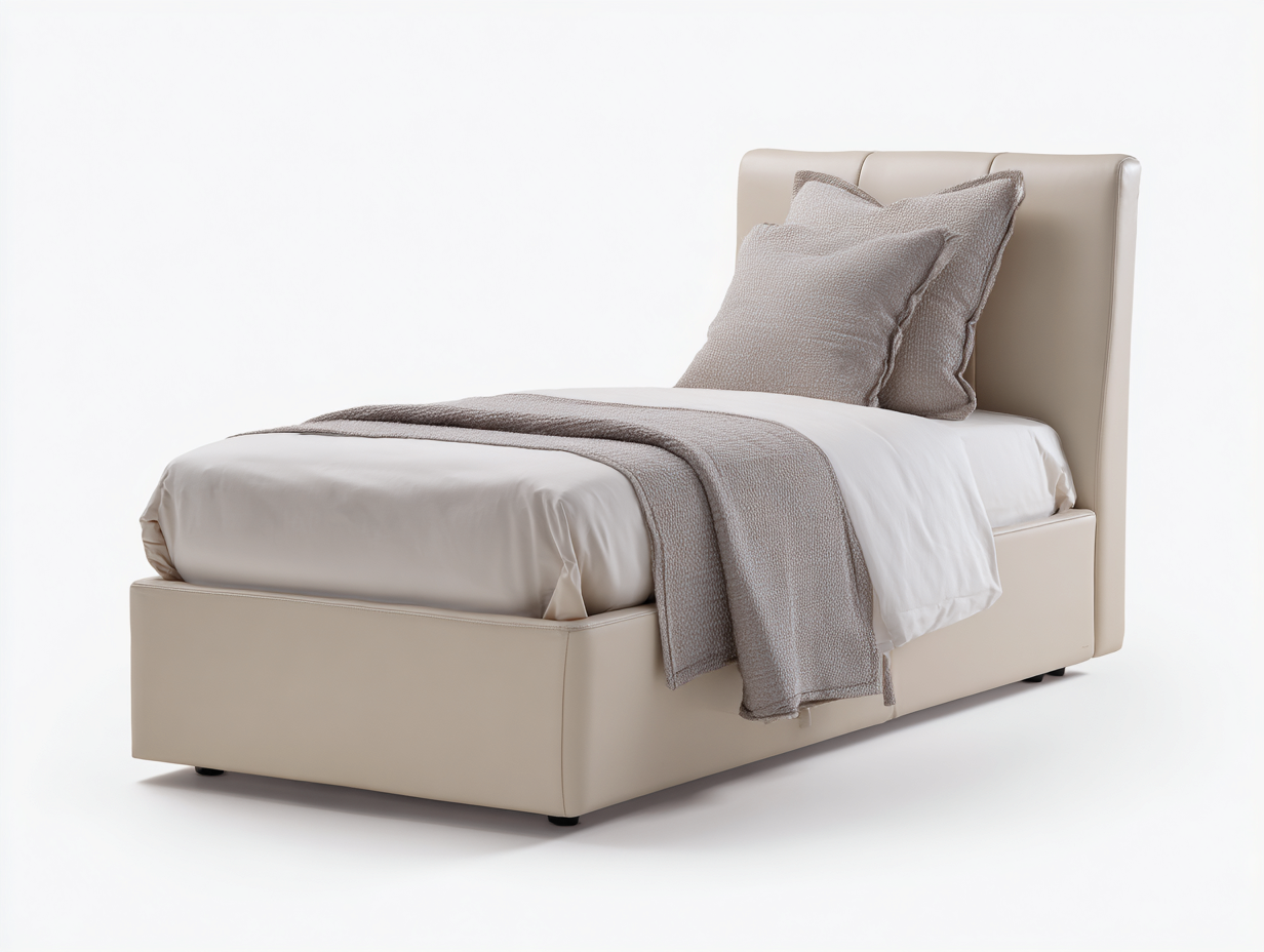 This single bed is designed for everyday use in modern bedrooms, offering a compact and comfortable sleeping solution. The clean lines and fully upholstered structure create a calm visual effect that fits well in contemporary interiors.